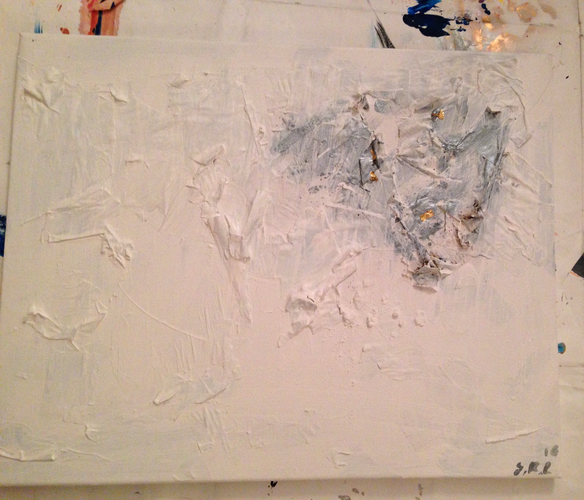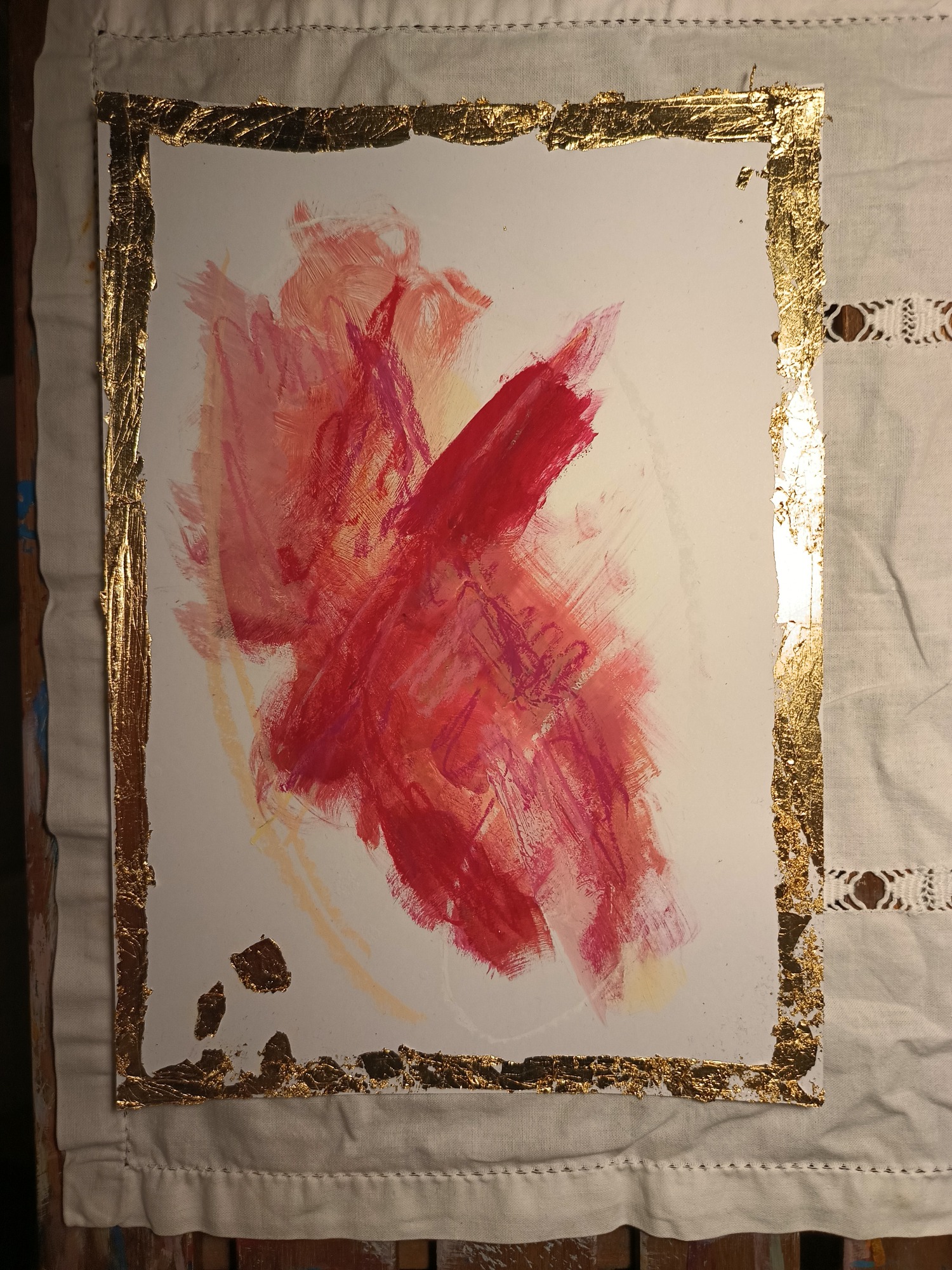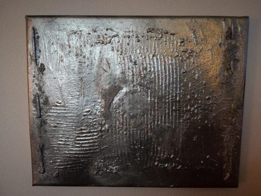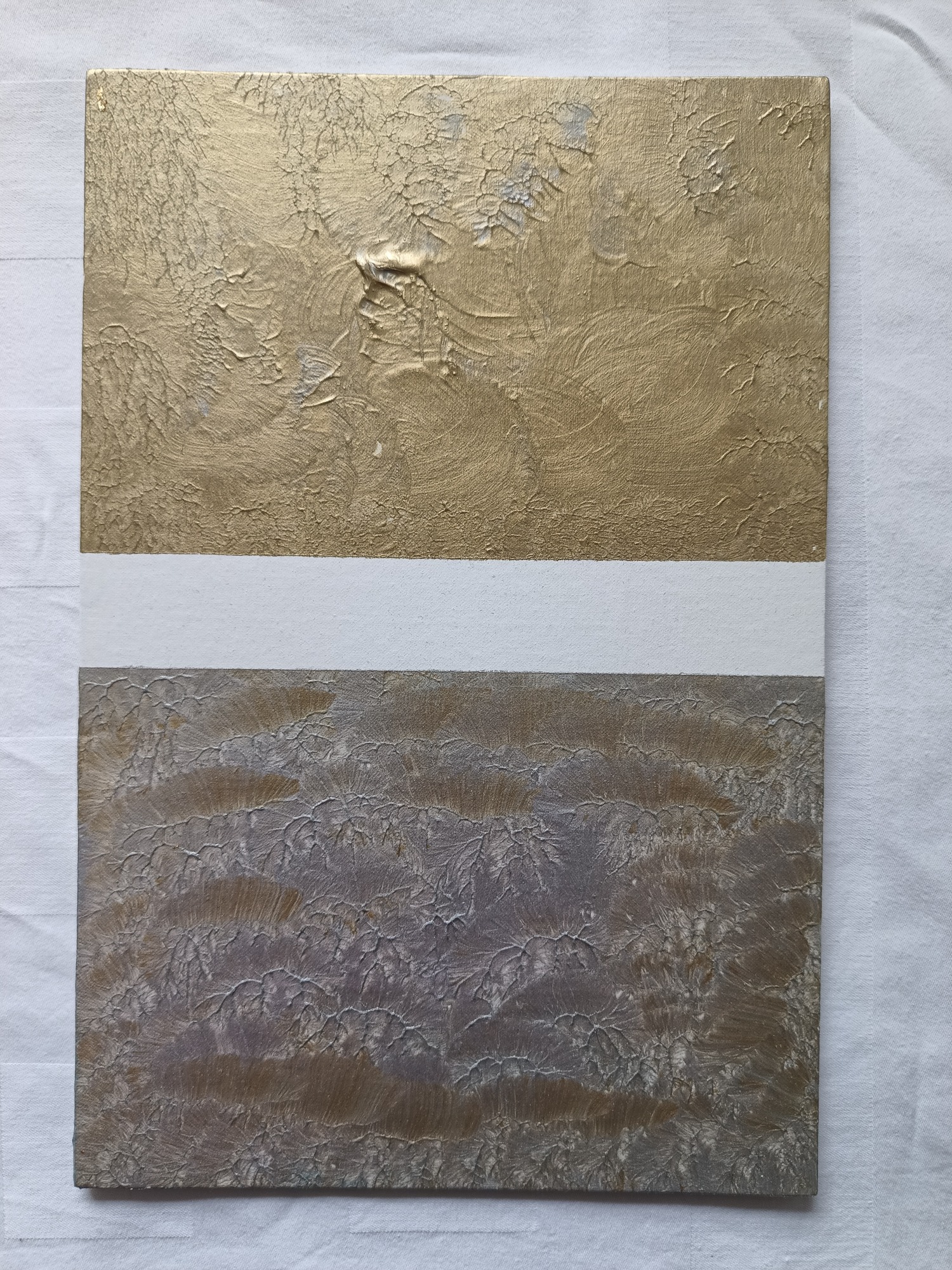 Ich habe mit zerrissenen Blättern, mit Spachteln, mit Strukturpaste und mit etwas Blattgold gearbeitet.