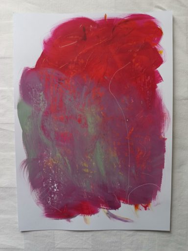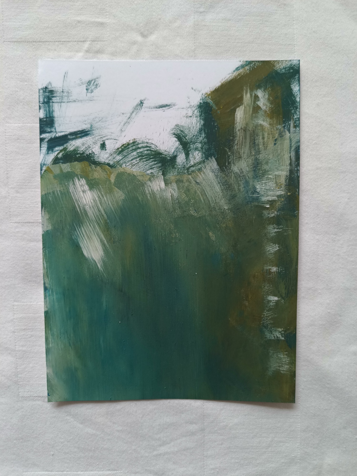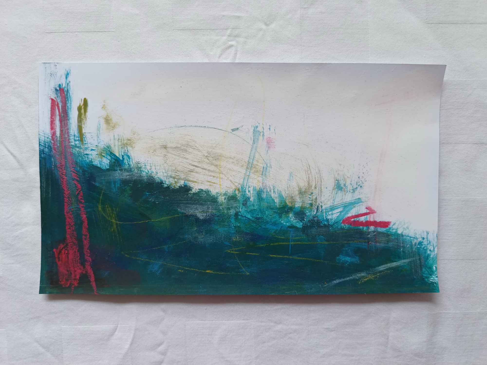 Ich habe mit unterschiedlichem Papier und Malkarton experimentiert. Außerdem mit Gouache, Ölpastellkreiden, Ölfarben und den dazugehörigen Medien (Pinsel, Trocknungsbeschleuniger, Ölen) und mit Kleister.